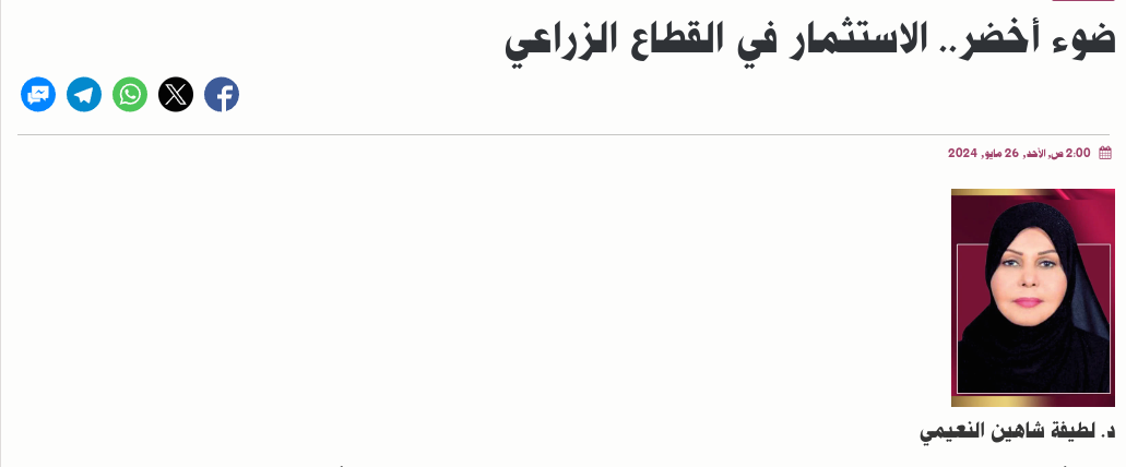 لا شك أن الإقبالَ على الزراعة والاستثمار الزراعي، مؤشرٌ مُهمٌ يعكس اهتمام دولة قطر بالقطاع الزراعي، خصوصًا أن المُستثمرين باتوا يُساهمون وبشكل فاعل في إثراء السوق القطري، بالأصناف المُختلِفة من الخَضراوات والفواكه، كما أن العائد من الإنتاج الزراعي، يعتبر أفضل مُقارنة بالقنوات الاستثماريّة التقليديّة الأخرى، باعتبار أن مزارع قطر تنتج إنتاجًا وفيرًا عالي الجودة، ويزداد هذا الإنتاج عامًا بعد عام، ما يُحقق الاكتفاء الذاتي.
