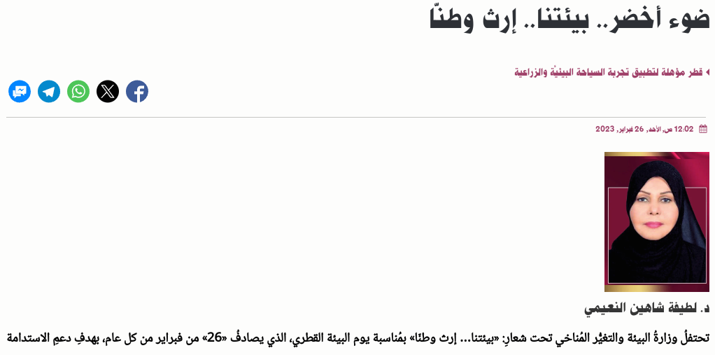 تحتفلُ وزارةُ البيئة والتغيُّر المُناخي تحت شعارِ: «بيئتنا… إرث وطنّا» بمُناسبة يوم البيئة القطري، الذي يصادفُ «26» من فبراير من كل عام، بهدفِ دعمِ الاستدامة البيئيَّة، حيث تُولي الوزارة اهتمامًا بالغًا بتنفيذ البرامج والمشاريع والمبادرات البيئية، كما أنَّ الفعاليات التي يتضمنها الاحتفال السنوي تهدف إلى زيادة الوعي البيئي بين الجمهور، وتعزيز المعارف والمهارات والاتجاهات والقيم المرتبطة بسلامة وتعافي بيئة قطر وجمالها والمُحافظة عليها، وتنمية رُوح المبادرة والحس البيئي لدى المواطن والمقيم.